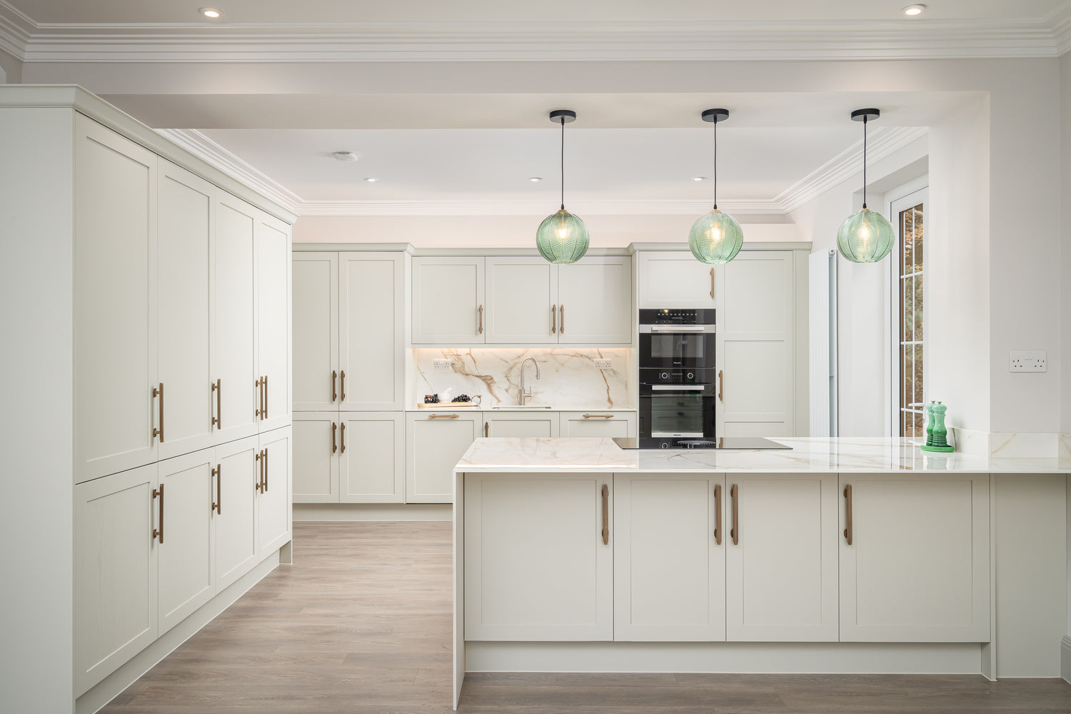 With a pale pink-beige as a base colour, this scheme is complimented by pastel moss green, with a deeper soft brown providing depth and dimension, as demonstrated in the marbled veins on the worktop.