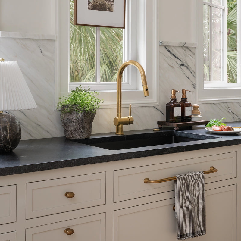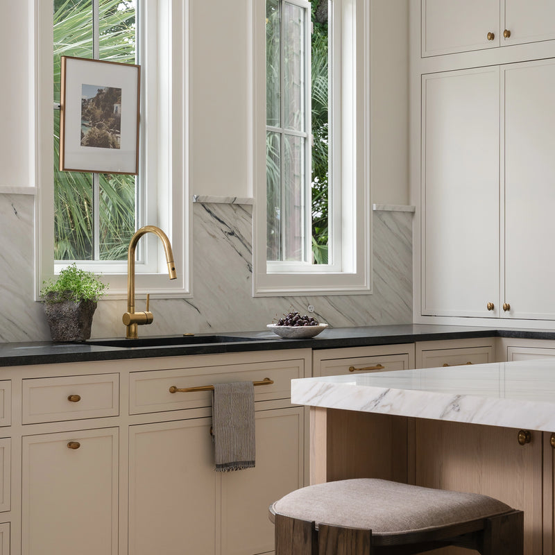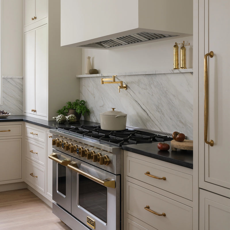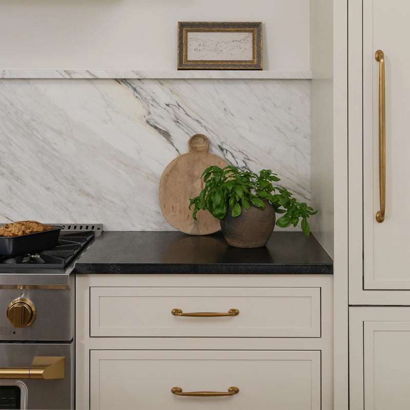 The Greenwich Collection in Burnished Brass completes the story. Pull handles and oval knobs are styled throughout, their gentle curves beautifully echoing the shapes found throughout the kitchen, from the arched faucet to the softened edges of the island. The burnished brass finish brings depth and warmth, offering a lived-in look that feels classic but perfectly at ease in a contemporary setting.
