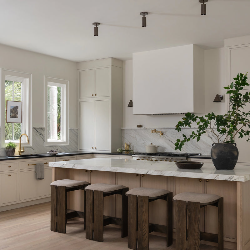 "This kitchen is designed to be functional while feeling deeply inviting. Thin shaker cabinetry in a soft neutral, warm wood accents, a sculpted box hood, and the use of marble stone set the stage, while the Greenwich pull handles and oval knobs in burnished brass complete the story. The hardware has a luxury and weight to it that makes the kitchen both warm and beautiful.”