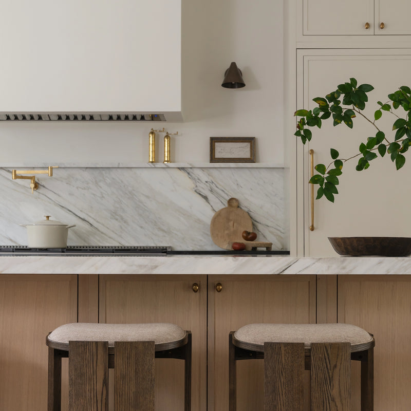 This kitchen balances classic details with a fresh, modern approach. Thin shaker cabinetry in a soft, neutral tone provides a tailored backdrop for the material palette to take centre stage: